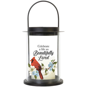 Lantern - Glass Cylinder - "...so Beautifully lived." Cardinal - Candle - 10.25"