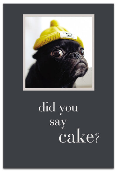 Celebrate a dog lover's special day with this charming birthday greeting card. Featuring an adorable canine companion and the playful message "Did you say cake? I'm there," this card brings warmth and humor to birthday wishes. Perfect for pet enthusiasts of all ages, it's an ideal way to add a smile to someone's celebration. A thoughtful choice for anyone who shares their life with a furry friend.