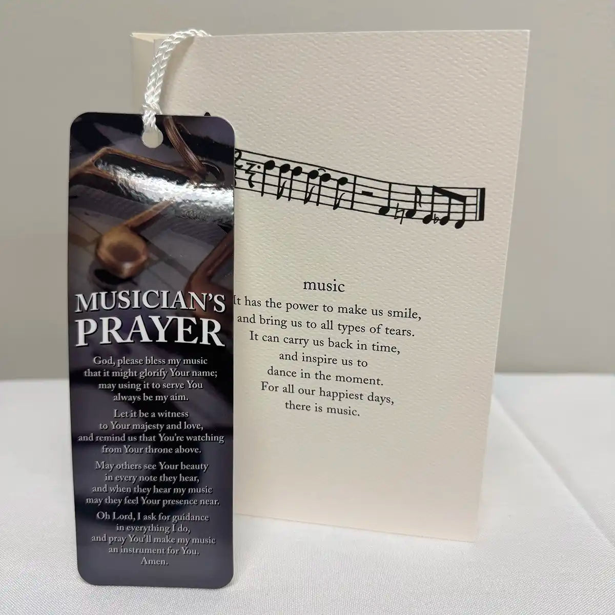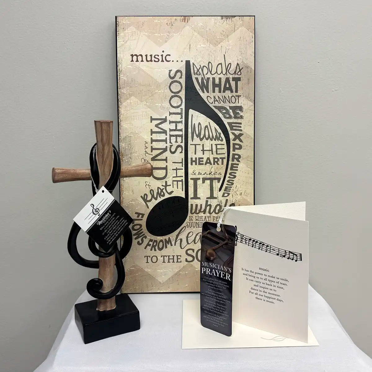 Harmony in Heaven celebrates the musical legacy of those who brought joy through their art. This thoughtfully curated collection honors musicians with a distinguished pedestal cross, an inspirational "Music Speaks" plaque that captures the universal language of melody, a elegant bookmark featuring a musician's portrait, and a heartfelt birthday greeting card. Each piece serves as a meaningful tribute to the profound impact music has on our lives and memories. Perfect for memorial services, celebrations of life, or as a compassionate gift for those grieving a beloved musician. Together, these items create a comprehensive remembrance ensemble that acknowledges both the person and their passion.